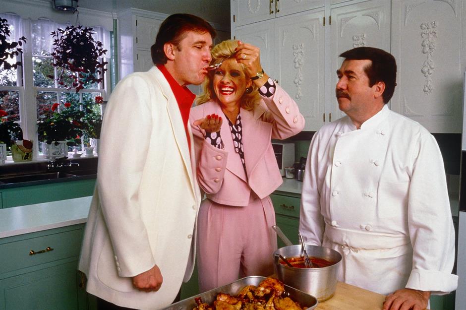 Luxury finishes and decorative flourishes were major trends in the 1980s, especially for those who wanted to put their wealth on display. Here, a young Donald Trump is pictured with his then-wife Ivana Trump in their Greenwich, Connecticut mansion in 1987. The kitchen behind them features a two-tone green and white cabinetry scheme, with elaborate mouldings applied to the front of the top row of doors.