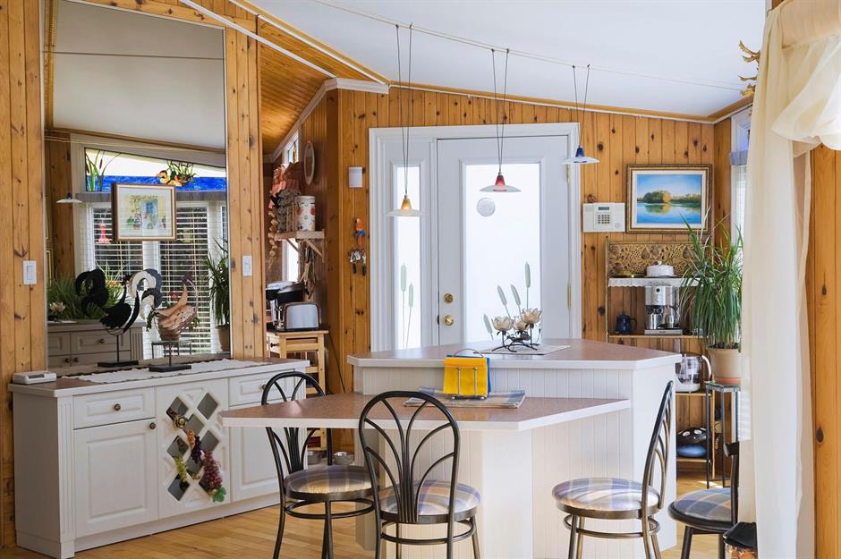Tongue-and-groove pine panelling became synonymous with 1980s rustic style, inspired by America’s love of log cabins and nature-themed interiors. Lining the walls of kitchens, living rooms and hallways, it created a warm, cosy backdrop for everyday family life. Seen here with a classic breakfast bar and timber cabinetry, it gave homes a handcrafted, lived-in feel that was both stylish and welcoming. Its golden tones and natural grain helped bring the outdoors in.