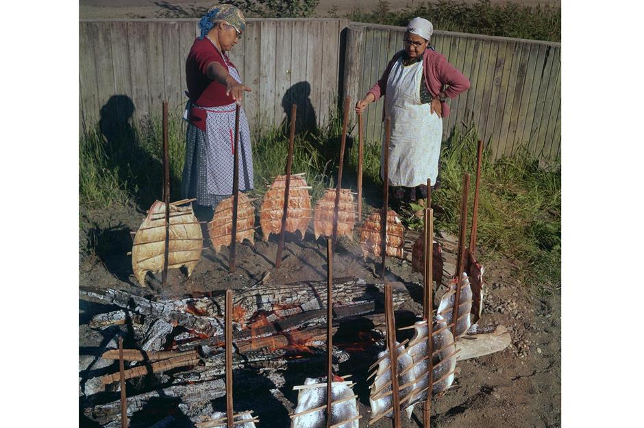 Photographed in 1955 near Neah Bay, Washington, USA, this image shows two Native American women preparing fish – likely salmon – on traditional wooden frames. The fish are butterflied and secured to split sticks, then slow cooked over an open fire. This method, practiced by people living on the coast, such as the Makah, served both for cooking and for preservation. Fire roasting and smoking fish have been central to Indigenous cuisine for generations, intimately connected to seasonal salmon runs and the community knowledge passed down over centuries.