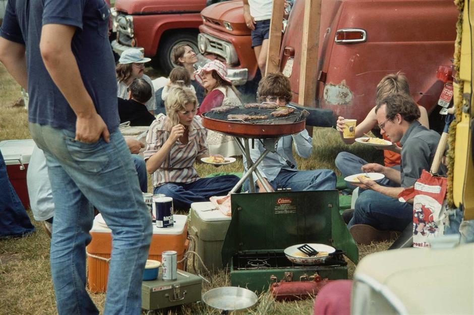 Taken on 28 May 1978, this photograph shows hungry spectators at the USA's 62nd Indianapolis 500 automobile race grilling beef steaks over a barbecue. Tailgating and informal cookouts have long been part of the Indy 500 tradition, with fans arriving early to stake out spots and fire up grills before and during the race. These impromptu feasts capture the event’s festive, all-day atmosphere and its enduring place in American sports culture.