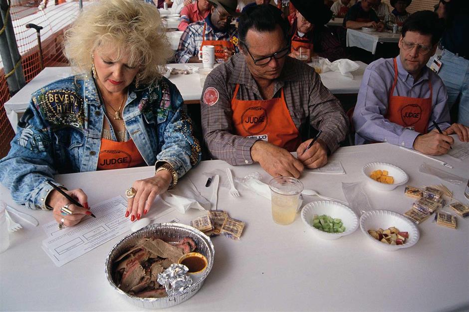 Photographed on 18 February 1994, this image shows judges evaluating brisket entries at the World’s Championship Bar-B-Que Contest, part of the USA's Houston Livestock Show and Rodeo. Dressed in official aprons, they score each sample for appearance, tenderness and taste. Drawing hundreds of competitive teams every year, the contest has become a cornerstone of Texas barbecue culture. To keep their palates sharp, judges are provided with tasting kits that include celery, cheese cubes and apple slices.