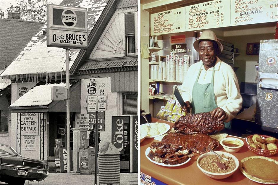 Pictured on the right in 1985, Bruce 'Daddy Bruce' Randolph stands behind the counter of his celebrated Denver barbecue restaurant, cleaver in hand as he prepares ribs. Renowned not only for his mastery at the pit but also for his generosity, Randolph established an annual Thanksgiving food distribution initiative, which fed thousands for free. The photograph on the left shows his original restaurant near 34th Avenue and Gilpin Street. A beloved local figure until his passing in 1994, Daddy Bruce left an enduring legacy in both Colorado barbecue and community service.
