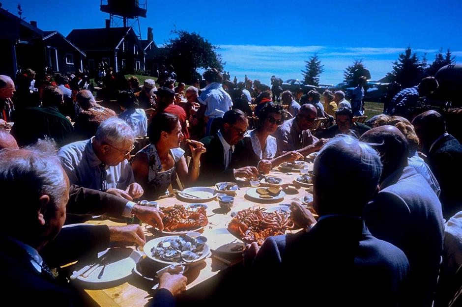 This photograph, taken on 13 September 1955, captures a celebratory seafood feast following the International Tuna Cup fishing tournament in Wedgeport, Nova Scotia, Canada. Dressed in suits and summer dresses, guests dined on platters of lobster, oysters and clams, showcasing the region’s maritime bounty. At the time, Wedgeport was regarded as the tuna capital of the world, attracting international teams eager to land massive bluefin tuna. After a hiatus in 1976 due to declining fish stocks, the event was revived in 2004.