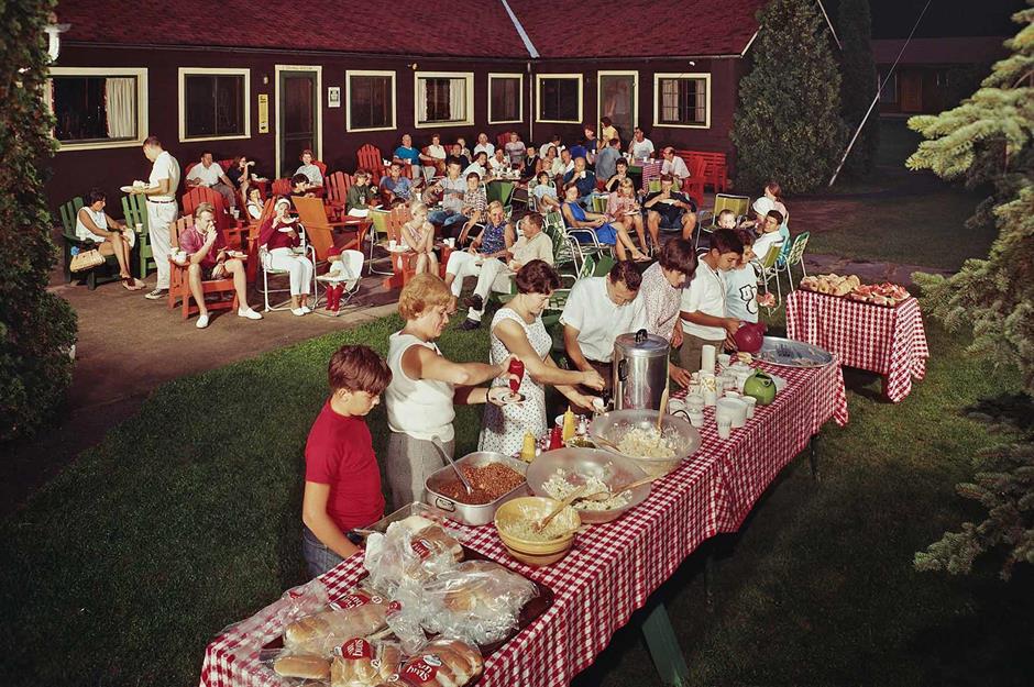This image captures a quintessential 1960s backyard barbecue, complete with checked tablecloths. Guests line up for picnic staples like baked beans, coleslaw, buns and soda, while dozens of people relax on folding chairs and Adirondack seats. There's even a dessert table laden with doughnuts and watermelon slices. Postwar prosperity, suburban growth and the mass production of outdoor grills helped make backyard barbecues a staple of mid-century American life. These gatherings reflected the era’s focus on community, leisure and the rising popularity of convenience foods.