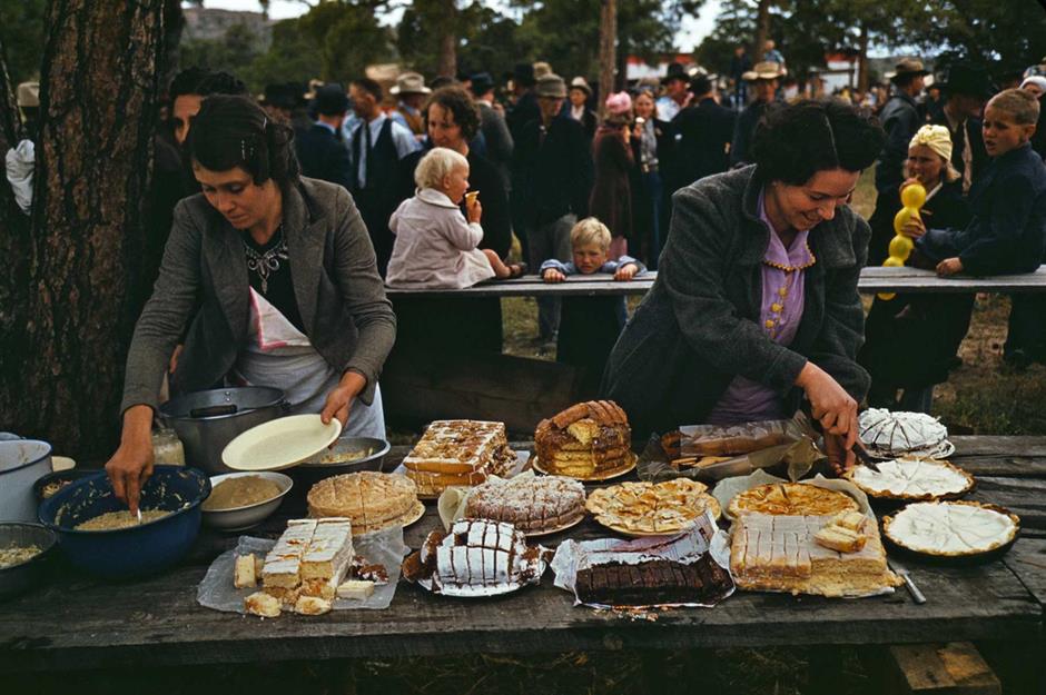 This image, taken around 1940, captures the dessert station at a barbecue dinner during the Pie Town Fair in New Mexico, USA. Women are shown cutting homemade pies and cakes, which were central to community gatherings in this remote settlement. Founded by Texan homesteaders in the 1920s, Pie Town gained its name from a roadside bakery. By the 1940s, its fairs and communal meals had become vital social events, offering comfort and connection during the hardships of the Great Depression and Dust Bowl.