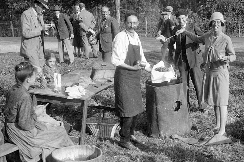 This photograph, taken during Boulogne Motor Week in September 1928, shows a group of men, women and children gathered around a barbecue. Held in northern France, the event was a popular fixture on the interwar racing calendar, attracting drivers and spectators from across Europe. The presence of a grill at the trackside highlights how barbecue had become part of a wider leisure experience, connecting outdoor cooking with sport and social gatherings even a century ago.