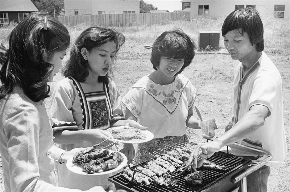 Photographed in Austin, Texas, USA around 1986, this image shows Thai immigrants grilling chicken skewers – likely gai yang, a beloved Thai street food. Barbecue in Thailand is often referred to as ping or yang, meaning 'grilled over flame'. Typically marinated in a mix of garlic, fish sauce, coriander root and white pepper, the skewers are cooked low and slow over charcoal. For many immigrants, dishes like this offered comfort and connection to home, preserving flavour traditions through shared outdoor meals in a new land.