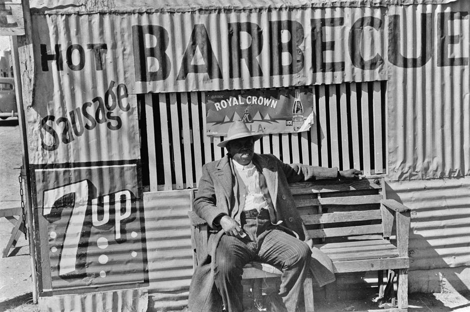 This 1939 photograph shows a man outside a modest barbecue stand in Corpus Christi, Texas, USA. The shack, clad in galvanised metal, features hand-painted signs advertising hot sausages and 7-Up. While Texas barbecue is best known for its emphasis on beef – particularly brisket, often smoked over oak or mesquite – sausages are equally central to the tradition. Typically made from beef or pork and smoked, they reflect the influence of 19th-century German and Czech immigrants, whose meat-smoking techniques continue to shape Texas barbecue today.