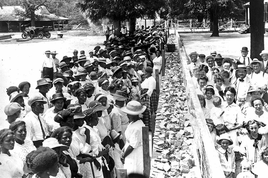 According to the Library of Congress, this photograph – taken in Alabama, USA between 1930 and 1941 – depicts 'F.M. Gay’s annual barbecue held on his plantation'. The event appears racially segregated, with a counter laden with sliced bread separating white and Black guests. Jim Crow laws, which enforced racial segregation in public spaces, remained in effect across Alabama until the Civil Rights Movement began dismantling them in the mid-1960s.