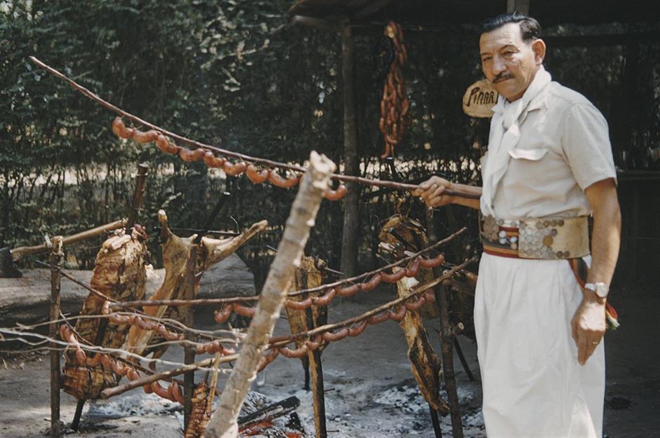 Photographed in April 1960, this image shows a man tending sausages and a whole butterflied lamb over an open fire in Argentina. Known as asado al asador or cordero al asador, this slow-cooking method uses a metal cross to suspend the meat beside hot coals. Asado is central to Argentine identity, rooted in the traditions of the gauchos – nomadic horsemen who cooked meat on the vast plains of the Pampas. More than just a meal, it remains a social ritual shared among family and friends across South America.