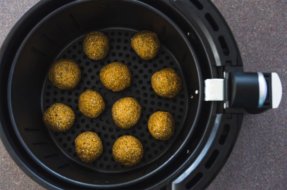 Alles zusammen pürieren und zu zwölf Falafelbällchen formen. Dann auf einen Teller legen und mit Öl besprühen. Die Heißluftfritteuse auf 180 °C vorheizen und die Falafel acht bis zehn Minuten lang garen, dabei einmal wenden. Sofort servieren.