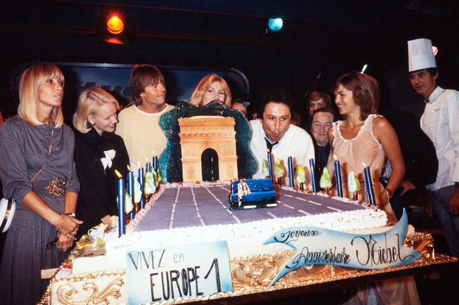 This 1983 photograph captures the 41st birthday party of French radio and television presenter Michel Drucker, held at Europe 1, the station where he hosted his own show. His elaborate cake, however, paid tribute to a different programme he presented: Champs-Élysées, a French TV variety show filmed at the Pavillon Gabriel, near the Arc de Triomphe. The famous arch – the show’s emblem – was recreated in confectionery atop the cake, accompanied by a miniature figure of Drucker perched on what appears to be a radio.