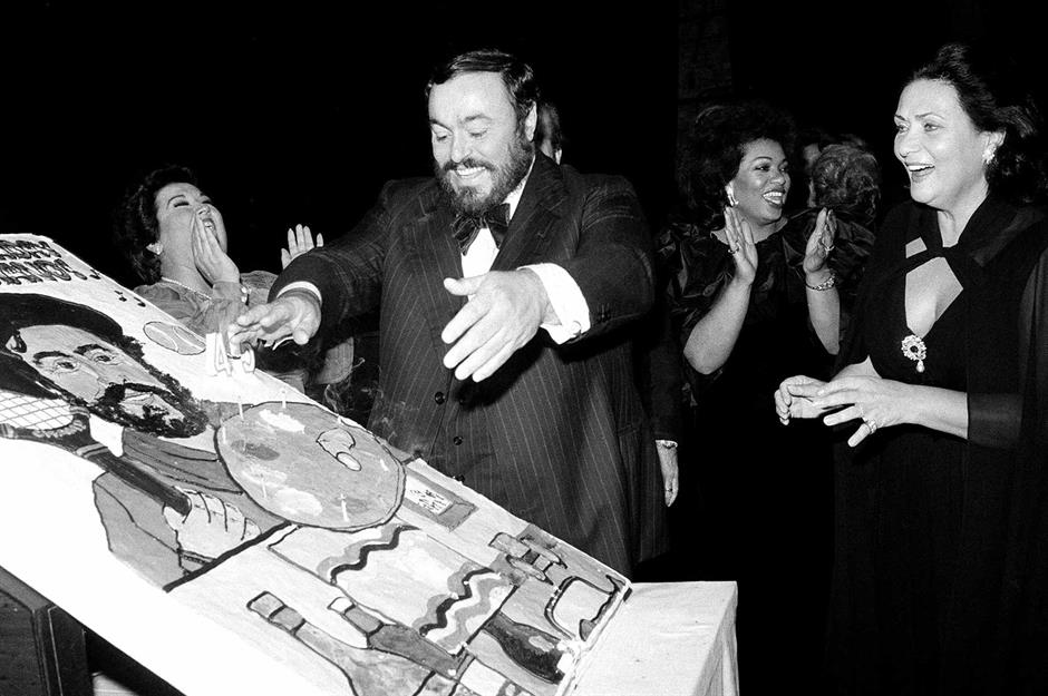 In 1980, friends and family of Luciano Pavarotti gathered in the heart of New York City to throw a surprise party for the Italian tenor's 45th birthday. Pavarotti is pictured here blowing out the candles on an impressive slab cake decorated with a portrait of the singer, along with depictions of his favourite pastimes and interests. The design included a racket and tennis ball, as well as an artist’s palette – fitting symbols of his well-known passions for tennis and painting.