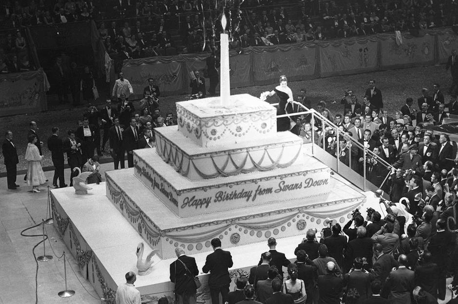A year after the release of the epic adventure-comedy Around the World in 80 Days, the film’s producer, Mike Todd, celebrated its first anniversary in 1957 with a spectacular event at New York City’s Madison Square Garden. 18,000 people attended the televised extravaganza, which featured an enormous 14-foot (4.3m) cake with five oversized tiers, blue icing and a towering candle. American actor Elizabeth Taylor, Todd’s wife and one of Hollywood’s brightest stars at the time, is pictured here on a specially built platform, poised to cut the 1,000lb (454kg) confection.