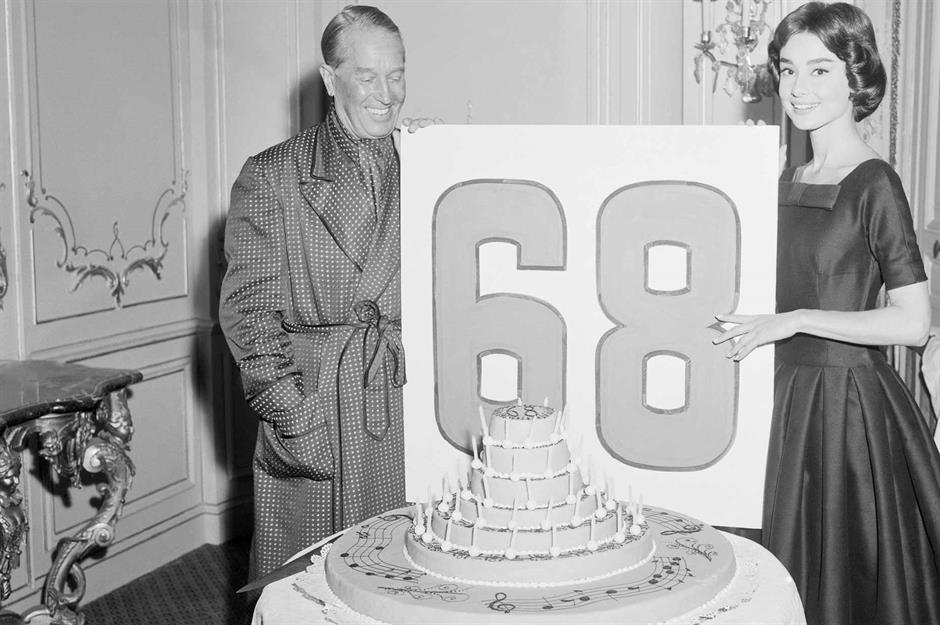 Legendary French singer and actor Maurice Chevalier celebrated his 68th birthday in 1956 while filming the romantic comedy Love in the Afternoon, directed by Billy Wilder. He's photographed here on set with his co-star, iconic British actor Audrey Hepburn, holding a large placard displaying his age in front of a beautifully detailed birthday cake. The six-tier sponge creation is adorned with candles, while the fondant-covered base is decorated with a musical score, paying tribute to Chevalier’s enduring contributions to the musical-comedy film genre.