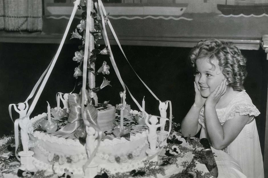 The most famous child star of Hollywood’s golden age, Shirley Temple shot to stardom in the early 1930s, beginning her career at just three years old with films such as War Babies and Bright Eyes. This 1936 photograph captures her at 20th Century Fox Studios in Los Angeles on her seventh birthday, her signature pin curls framing her face as she admires an elaborate cake. The towering confection is crowned with a maypole wrapped in flowers rising from the top tier, its six ribbons cascading into the hands of dancer figurines arranged around the cake.