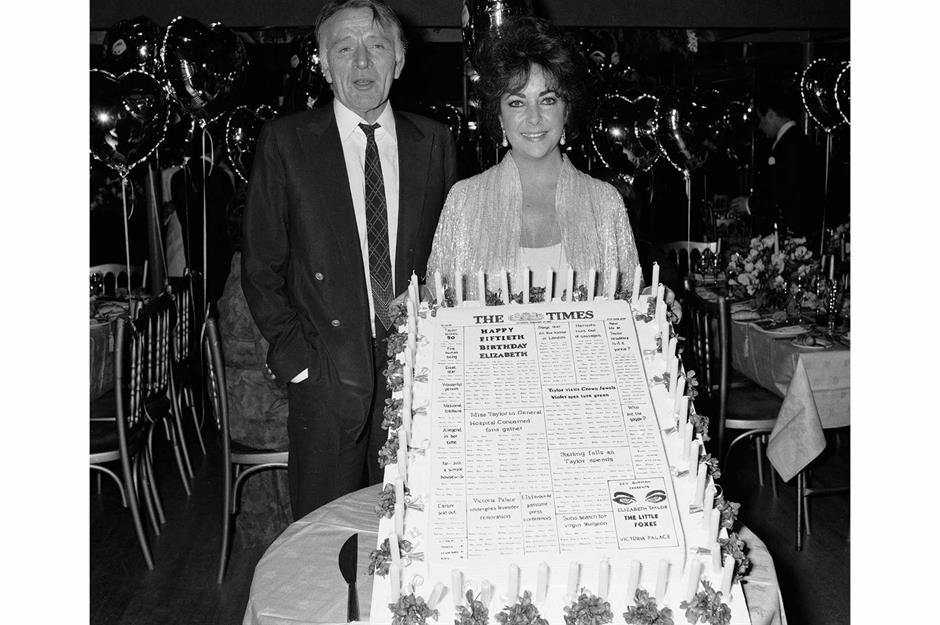 American actor Elizabeth Taylor celebrated her 50th birthday in style in 1982 with an extravagant party at London’s Legends nightclub, where her twice-ex-husband, Welsh actor Richard Burton, made a surprise appearance. The former couple is pictured here with Taylor’s remarkable birthday cake, designed to resemble the front page of The Times newspaper. Astonishingly detailed, the headlines highlight events from the star’s life and her well-known love of shopping, while an advertisement promotes The Little Foxes, the play in which Taylor made her Broadway debut the previous year.