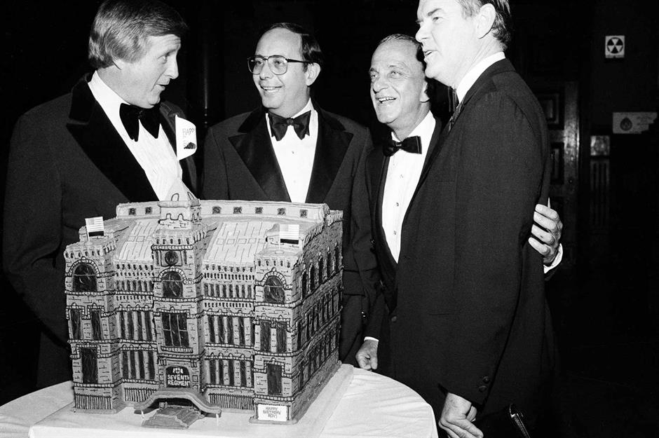 This 1981 photograph shows attorney Roy Cohn – whose clients ranged from future US president Donald Trump to mafia boss John Gotti and shipping tycoon Aristotle Onassis – celebrating his birthday alongside New York Yankees owner George Steinbrenner, Senator Alfonse D’Amato and lawyer Tom Bolan. The party took place at New York City’s Seventh Regiment Armory, a grand 19th-century building on Manhattan’s Upper East Side. Cohn’s architectural birthday cake paid tribute to the venue itself, complete with towers, battlements, a distinctive roofline, windows and brickwork.