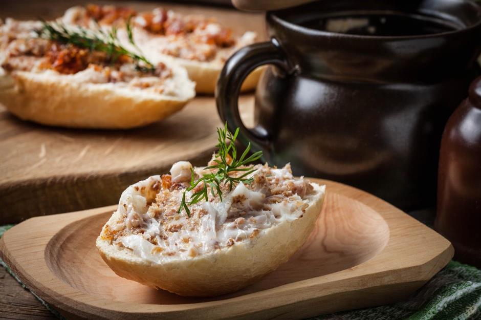 Falls Sie jetzt davon ausgehen, dass es sich um ein Fischgericht handelt, liegen Sie falsch. Die pürierte Delikatesse besteht aus Kartoffeln, gepökeltem Rindfleisch und eingelegter Rote Beete. Allerdings wird dazu manchmal tatsächlich auch Rollmops serviert.