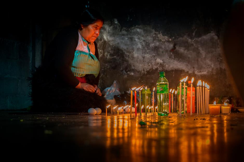 Entre los destellos, las botellas negras reposan frente a los santos, junto a gallinas, flores y montones de velas que arden sin descanso. Una mujer tsotsil susurra una plegaria y bebe un trago. El eructo que sigue no es descortesía: es parte del ritual. Dicen que así se libera el mal que oprime el cuerpo.