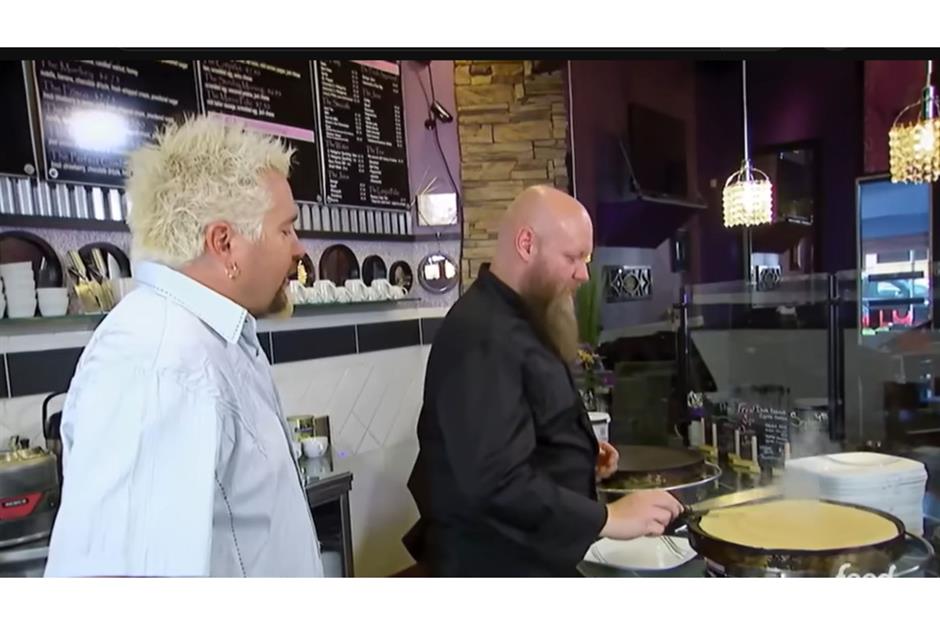 This purple-hued joint does crêpes its own way. Fieri has visited the popular spot twice and was quick to praise its originality and powerful flavors. Go savory with the Chicken Chili Verde crêpe (shredded chicken, roasted green chili sauce, cilantro-lime crema, and Jack cheese), or try a sweet one with fresh blueberries and lemon custard.