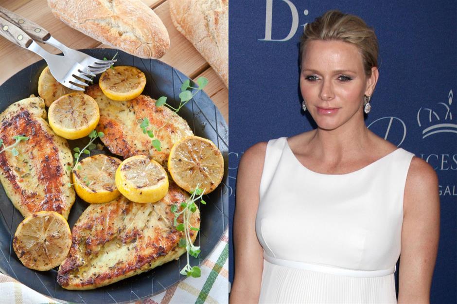 The statuesque Zimbabwean, a former Olympic swimmer who married Prince Albert II of Monaco in 2011, is said to have a fondness for lemon chicken seasoned with African spices. She stays in shape by focusing on a diet rich in fish, fresh fruits and vegetables, and she drinks plenty of water each day.