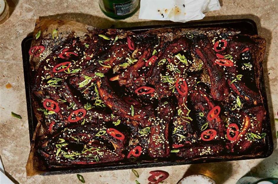Really great ribs, such as these not-too-sweet, wonderfully sticky and spicy pork ones, are a labour of love. They need to be marinated overnight, then gently cooked in the oven until meltingly tender. The good news is that once cooked, they can be frozen. When ready to eat, thaw them completely, add a little extra marinade and reheat in a very hot oven.