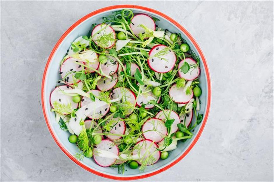 For a sweet, crunchy summer salad, try this dish. Put 12oz (350g) peas in a salad bowl and scatter over 10 thinly sliced radishes, a chopped spring onion and a crumble of feta or cottage cheese. Loosen 3 tbsp crème fraîche by mixing it with a little milk, drizzle it over the salad, then add your favourite pre-cooked grains to make it more filling.