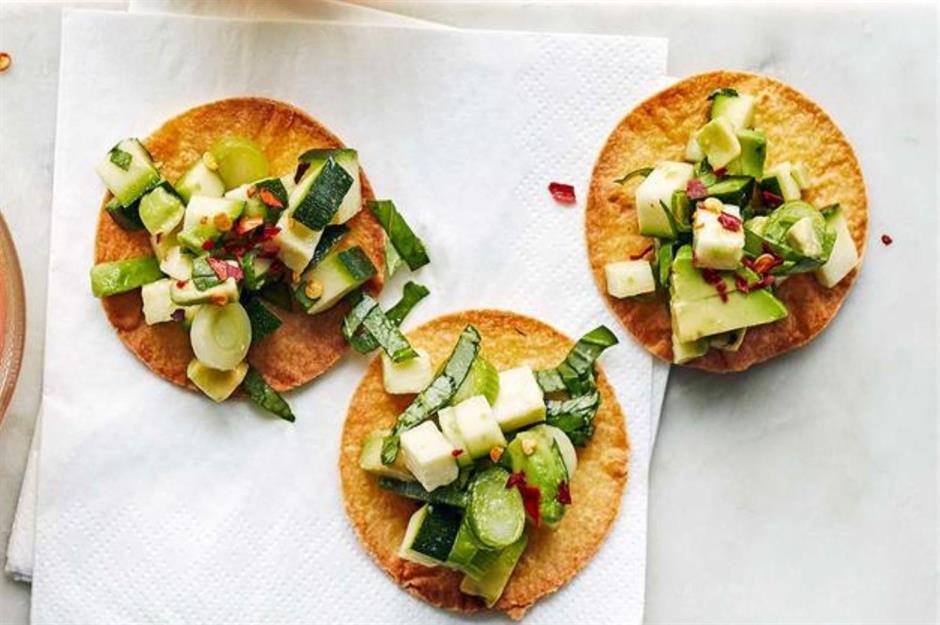 In need of a fresh, zingy and tasty snack or light lunch? These easy courgette tostadas are your new go-to. Finely diced courgette is briefly marinated in lime juice, maple syrup, oil and salt, then mixed with basil, spring onions and avocado. The mix is then piled onto tostadas (buy them ready made to avoid baking circles of tortilla wraps) and finished with a sprinkle of chilli flakes.