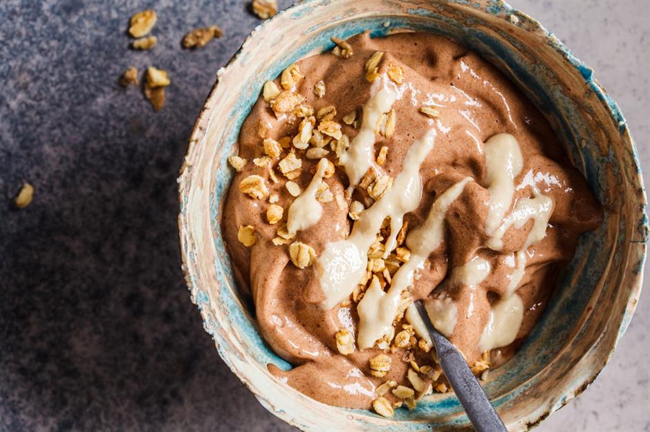 The secret to healthy ice cream in five minutes is frozen bananas. For an easy dessert, try whizzing three bananas with 3 tbsp cocoa powder and 1 tbsp chocolate almond milk – and, just like that, it's ready! Pair with a sprinkle of chopped nuts and a wafer biscuit for a seriously delicious dish. A word of warning: this dessert melts quickly, so be sure to serve and eat it immediately.