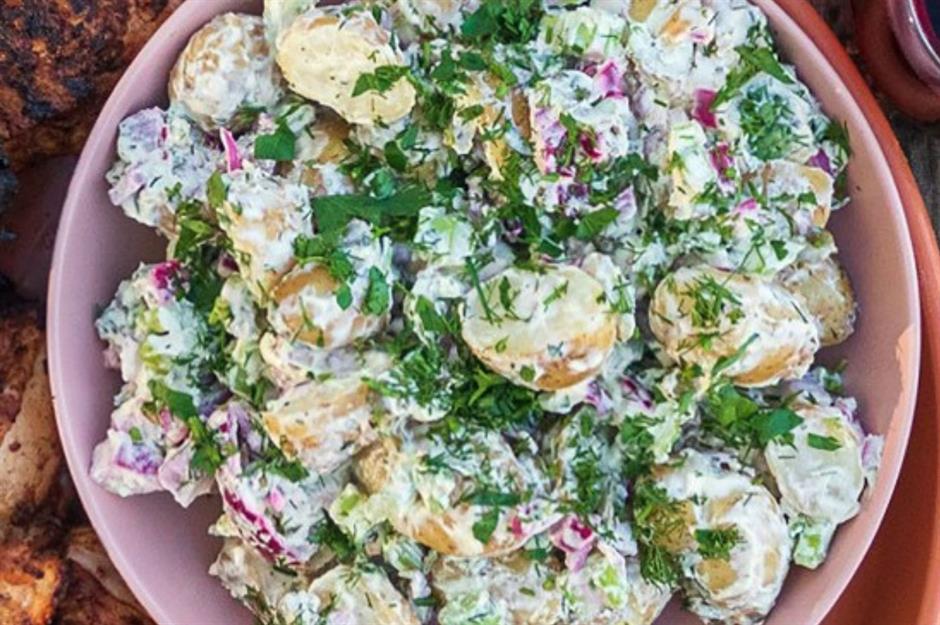 Canned cooked potatoes are perfect for potato salad. You'll barely taste the difference once you've added the soft cheese, lemon juice, capers and fresh herbs in this recipe. Chopped celery and red onion will give the dish some much-needed crunch. Serve it with a fillet of smoked mackerel or slices of smoked salmon.