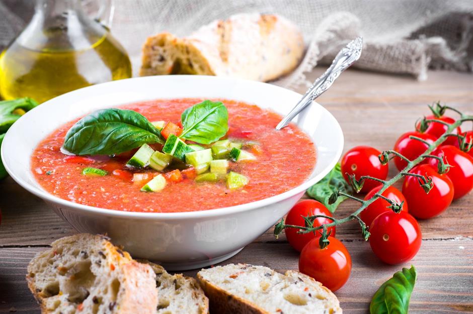 Classic tomato gazpacho is given a salty makeover with the addition of green pitted olives in this tasty recipe. It can be made ahead of time, allowing you to chill the cold soup in the fridge before serving it to guests at a dinner party – or you can pop in a few ice cubes to bring the temperature down. Serve it with ready-made croutons, sliced olives and a drizzle of olive oil.