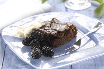 Far more exciting than your regular brownie, and perhaps a little better for you! This chocolate slice is made from dark and milk chocolate, butter, walnuts and light muscovado sugar, and gives off a pretty purple-ish hue, thanks to the punnet of blackberries in the mix.