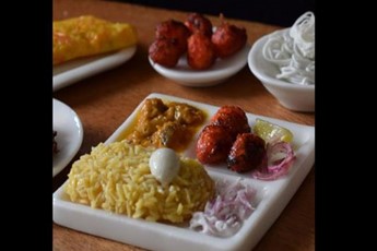 Living in India, much of her collection features traditional dishes like this Bengali thali consisting of chloas dal, shukto, aloo bhaja, tomato chutney, polot bhaja, hilsa fry, rice and luchi.