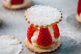 This striking dessert draws the tea-time favourites of cream and strawberries together into an elegant whole. There are a fair few steps involved in this recipe, but the delicate end result is worth the effort – and you'll probably have left over sable biscuits to snack on for the rest of the week.