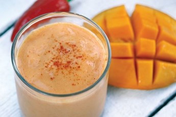 You can add a little kick to your smoothies by adding chilli powder. You might also experiment with fresh chilli, but be careful not to overdo it! The cool sweetness of the mango is a superlative companion to the heat, and this particular smoothie also has bitter goji berries and apple juice to balance things out.