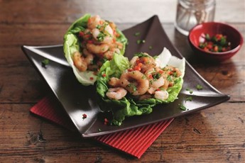 These Asian prawn boats are really easy to make. Take cooked prawns (hot or cold) and mix them with a little soy sauce, coriander, chilli and garlic, then spoon into a gem lettuce leaf and listen to the 'crunch!'