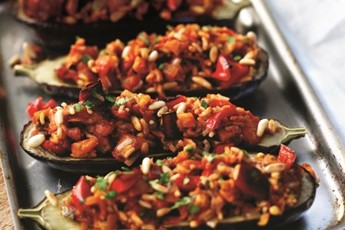 Aubergines only have around 25 calories per 100g, next to no fat, and lots of vitamins C and B-6. It's also a good source of minerals. In this recipe, the aubergine flesh is scooped out, diced, then mixed with coriander, pine nuts and onions, among other bits and pieces, then placed back into the baked 'shell'. Pure goodness!