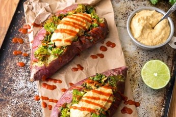 Each of these potatoes, even when stuffed with greens and with a dollop of hummus on top, is only around 300 calories. Very filling, very healthy, very tasty. You can get reduced fat hummus in stores to help out, but there's not a particular need since the calorie count here is so low and it's not usually that good anyway. Sweet chilli sauce also goes well with these, but this tends to have rather a lot of sugar, so use sparingly.