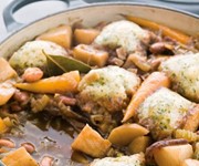 A colourful vegetarian stew, packed full of onions, celery, leek, turnips, carrots, mushrooms and borlotti beans, all in a rich stock made velvety with the addition of strong brewed coffee. Top with homemade cheddar cheese and parsley dumplings, and serve in big bowls.