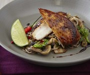 Chicken breasts coated in a sticky marinade made from soy sauce, mirin, orange, water, sugar and a little ginger. Pan-fry your chicken until golden brown, then add a ladleful of teriyaki sauce and cook until beautifully glazed. Serve with chilli garlic mushrooms, noodles and chopped coriander.