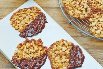 Super-quick and super-easy, these biscuits are crunchy and chocolately. Mix butter, apricots, peanuts and sugar together and form the biscuits by hand. Everything you want on a gloomy day, ideally with a strong cup of coffee or tea, and ready in just 20 minutes!