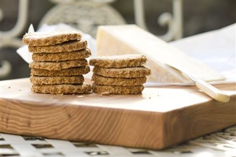 Rough Scottish biscuits made with just four ingredients. Mix oatmeal, salt and baking powder, combine with butter and water, then cut wedges out of the rolled-out mixture. Bake and top with cheese, ham, pickle, or anything else you fancy for a really versatile snack!