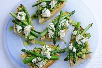 A light bite consisting of rustic bread, broad beans and asparagus, served with a light lemon, mint, mozzarella and olive oil dressing.
