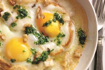 This easy breakfast dish is great for a Saturday morning to set you up for a big day. Rich, runny yolks sit on ciabatta, with melted goat's cheese weighing down the whites. Scatter over a handful of walnut pieces, and a splash of parsley sauce makes the whole thing taste even fresher.