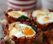A baked egg, nestled inside a cradle of pancetta and wrapped up in wilted garlicky spinach. The perfect breakfast for two, and very easy to make if you have a muffin tray. Toast some crusty sourdough bread and cut into soldiers for the perfect dipping material.