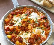 Add a little Mexican spice to your eggs with dried chillies, paprika, and diced spicy chorizo. Huevos rancheors is ‘ranch-style eggs’, which sees the eggs cracked into a thick, tomato and chilli sauce and then baked on the hob. Serve with tortillas or crusty bread on the side.