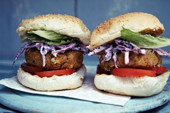Make a big impression with these chickpea burgers stuffed with Indian purple coleslaw and salad. Garam masala, chilli, cumin and coriander give these patties a wonderfully balanced spicy flavour.