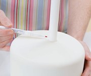 How to use dowels: If your cake is circular, you’ll need three dowels arranged in a triangle formation close to the centre of the cake; if it is square, use four. Confidently push one dowel into your iced cake and mark the dowel where it meets the top of the icing. Remove the dowel, trim it to size (it should now be the same height as the cake), and cut two or three more like it, depending on the shape of the cake. Push them all in – you should not be able to see any plastic above the cake – and place the middle tier cake board on top. Repeat!