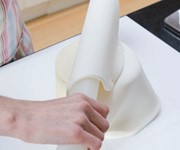 Use your palms to smooth it around and down the side of the cake. To avoid unsightly creases, pull the sugarpaste away from the side of the cake as you go until you reach the base.